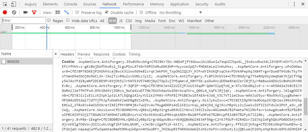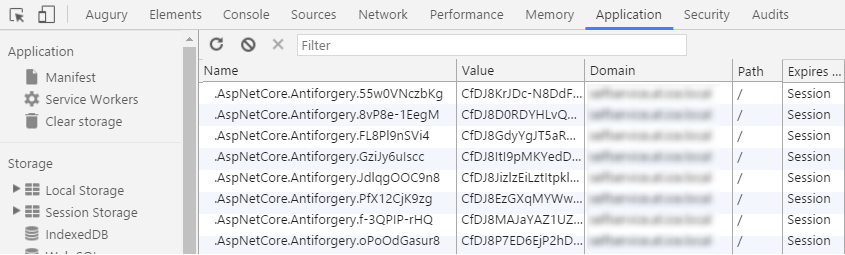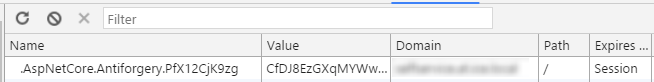 First, I verified that the anti-forgery mechanism was working just fine. Removing all the cookies made it impossible to post requests to the server - very good. Logging in to the website again, a new anti-forgery cookie was created: