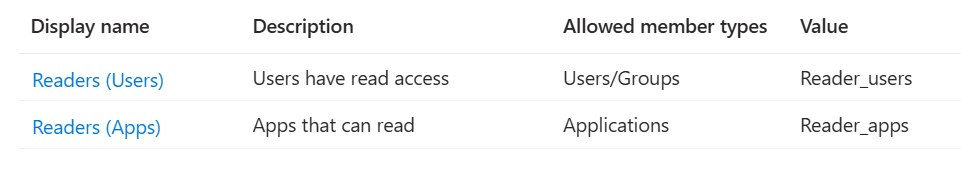Note 2: You can set the value to what you wish but I prefer to also make it easier to distinguish between user and app roles in code. You might need only user roles right now but apps and requirements evolve over time and at some point you might need a role for apps as well. Using a prefix or suffix to point the member type is a good way to ensure that you don't end up with something like this: