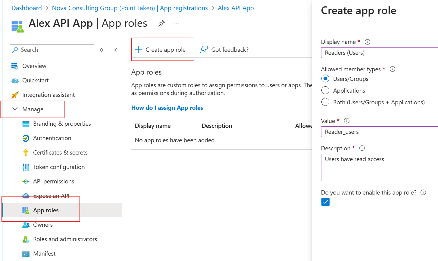 - Make sure the checkbox for "Do you want to enable this app role?" is checked otherwise will not be able to assign the role to a user.