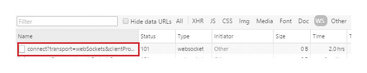 In the network log, select the "WS" filter to only show WebSocket connections.