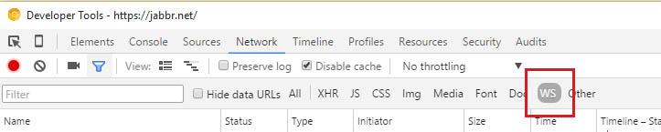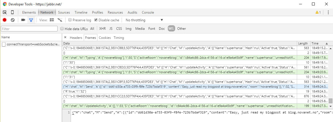 Since jabbr.net is based on signalR communication we should be able to track the messages in F12-tools.