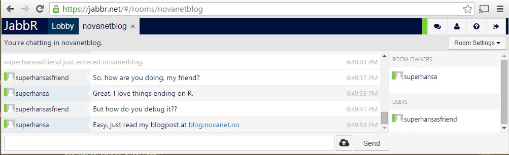 To quickly show how it works i created a chat room on http://jabbr.net, and joined with my Twitter account. My friend also joined: