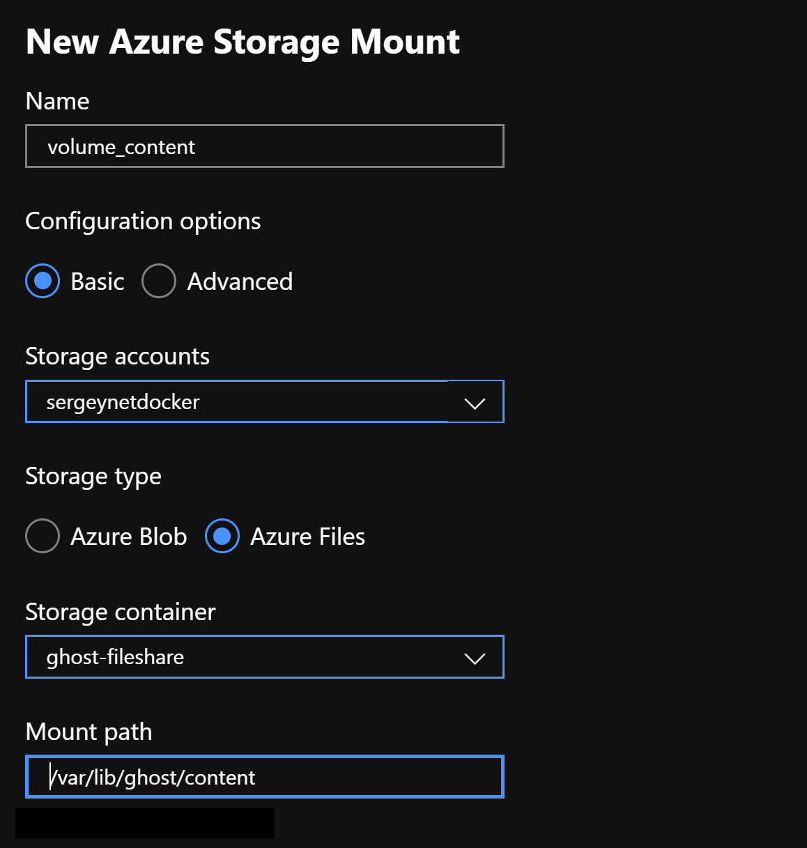 Now we are going to mount external storage for the ghost container running on App Service. For external storage we are going to use Azure Storage account. Read this post how to create azure storage account.