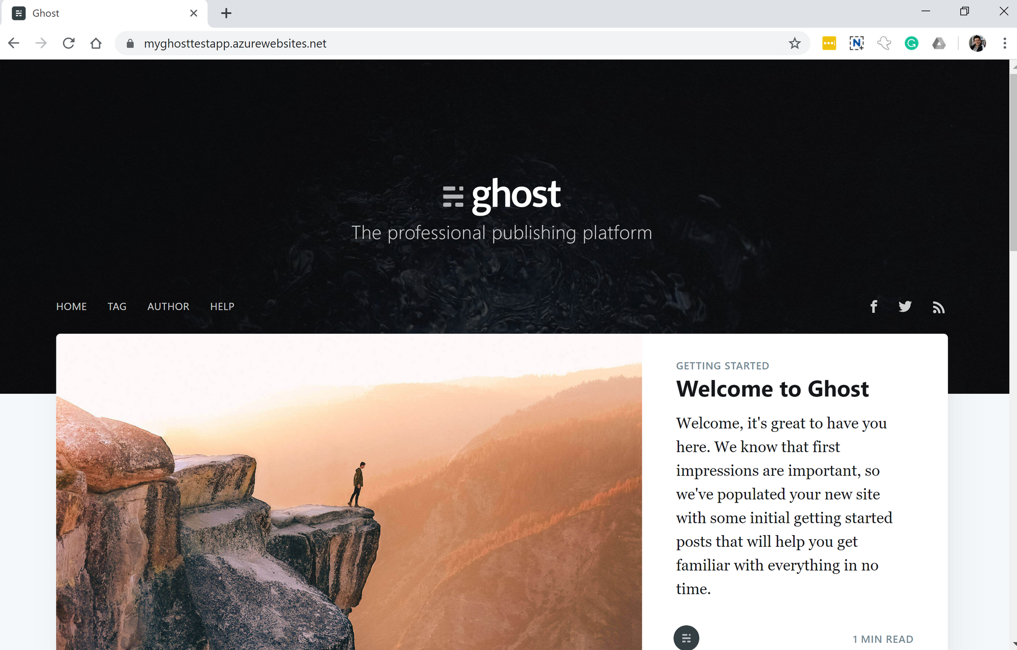 Now restart App Service in the Azure portal. And open the browser, wait for a while. You ghost platform should be in a good shape and looks like this.