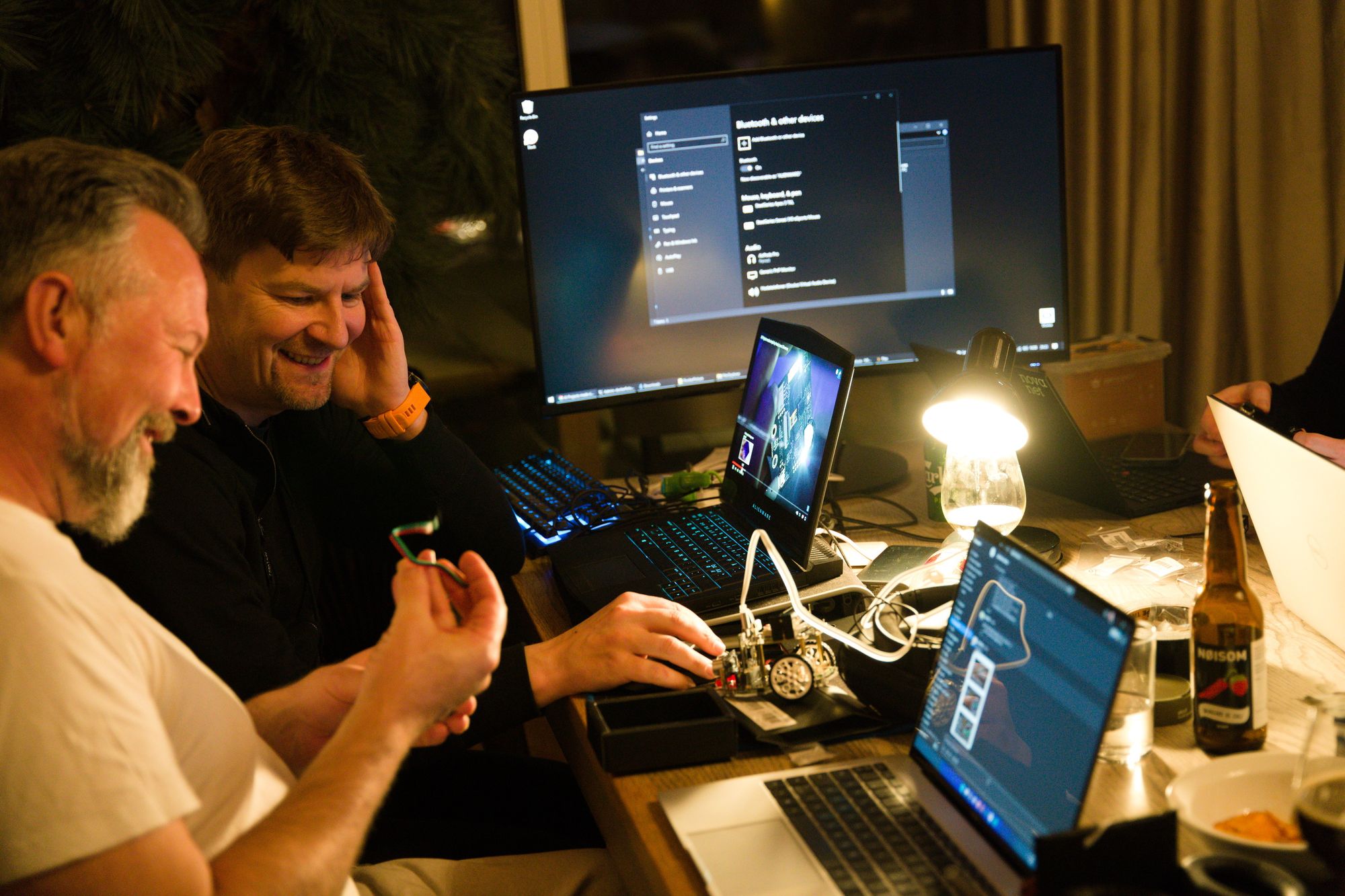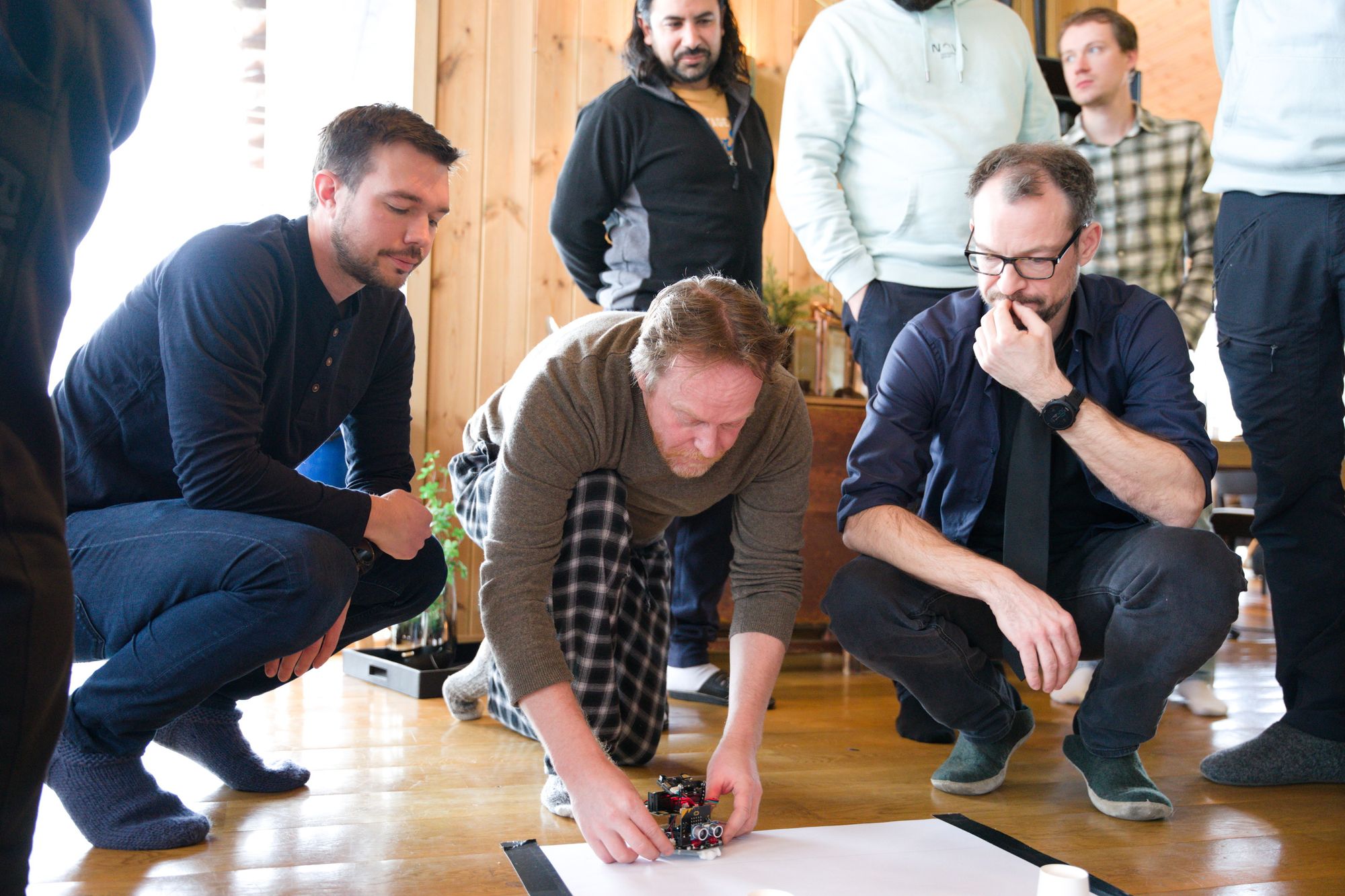 Work on the robots was done in the context of a Hackathon. We gathered at a cabin in Sjusjøen and divided the developers in 4 teams. The teams were presented with a set of badges that they could get when finishing a spesific task. This could be something like "Creative use of the LED display" or "Drive 1m west". Each badge gave the team points in the Hackathon-competition. We also had three competitions where the robots met in an obstacle course, a sorting assignment and an exciting robot battle!