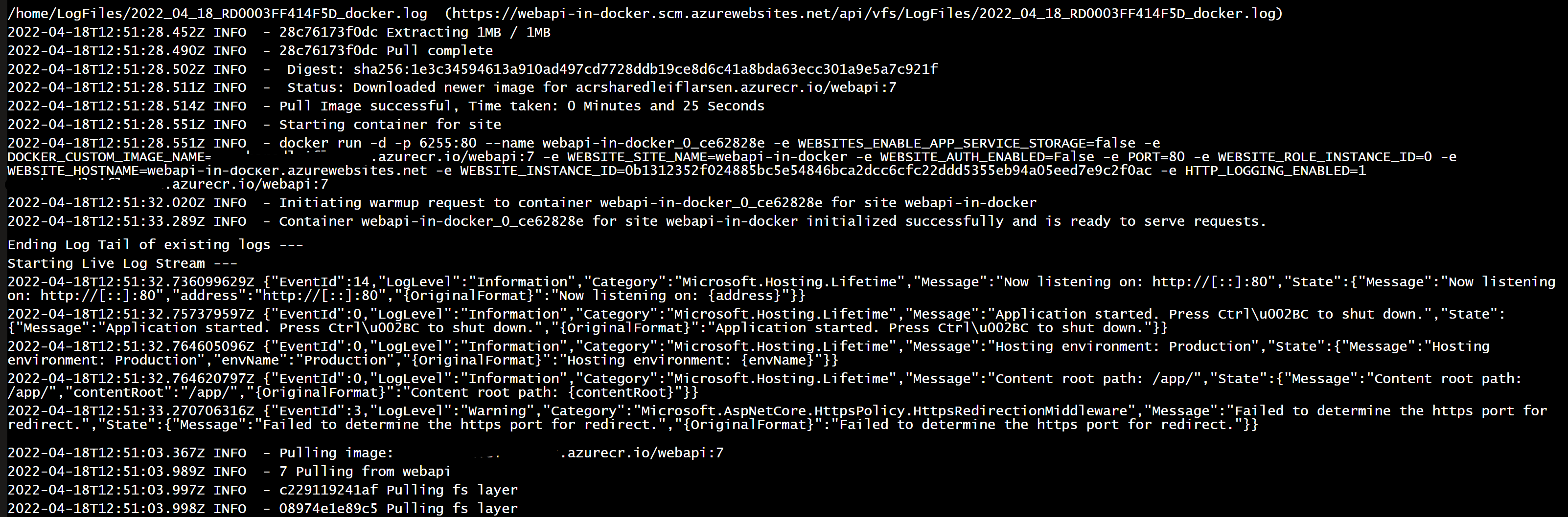 With this in place, the pipeline should be able to execute successfully. Once it has completed, you should be able to head over to the web app, on the /weatherforecast endpoint, and get similar results, as we saw above. You can also navigate to the log stream of the web app, and see that the Docker image is being retrieved and started. That can look similar to this: