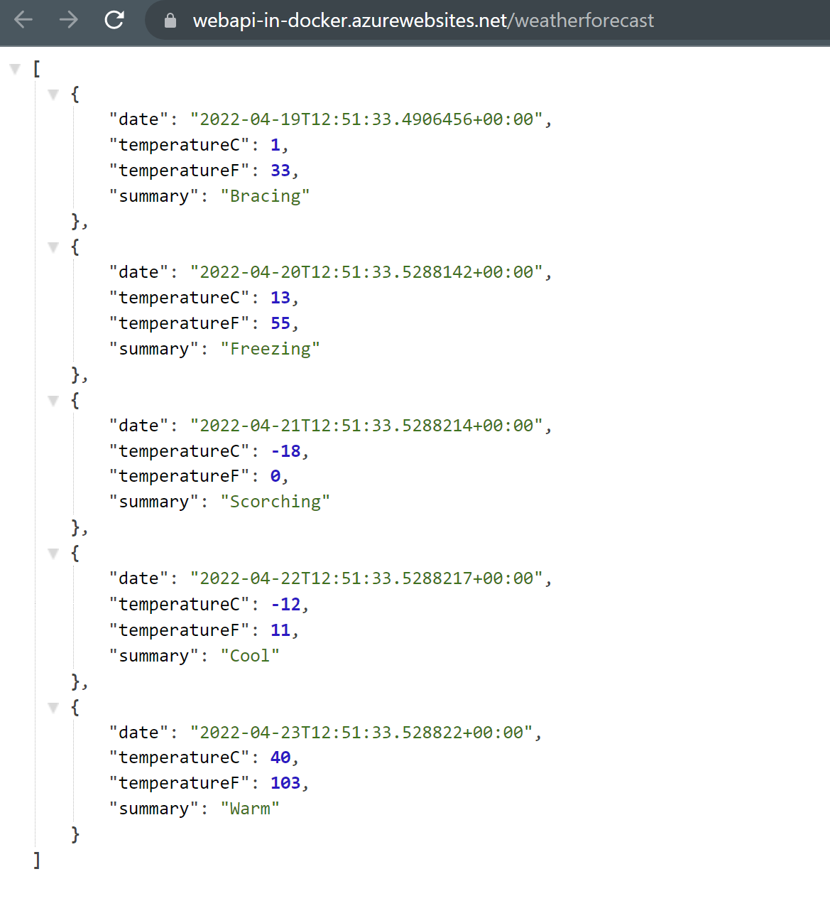 With the example app in place, you should be able to run it locally, as well as from a docker container. Either way, a GET call to the endpoint /weatherforecast should yield the following output: