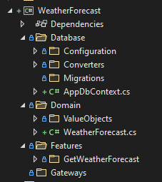 | WeatherForecast | Features, domain, database, gateways |