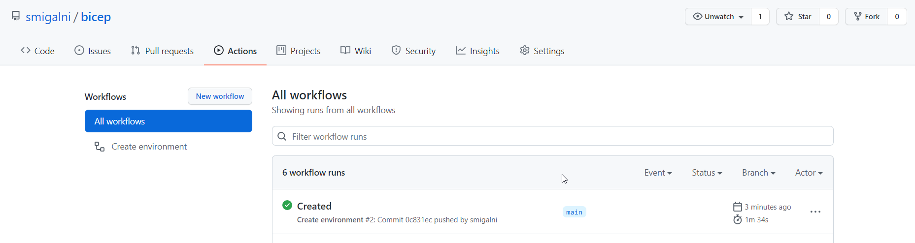 Check that you get the Action, called Create environment and it started to run: