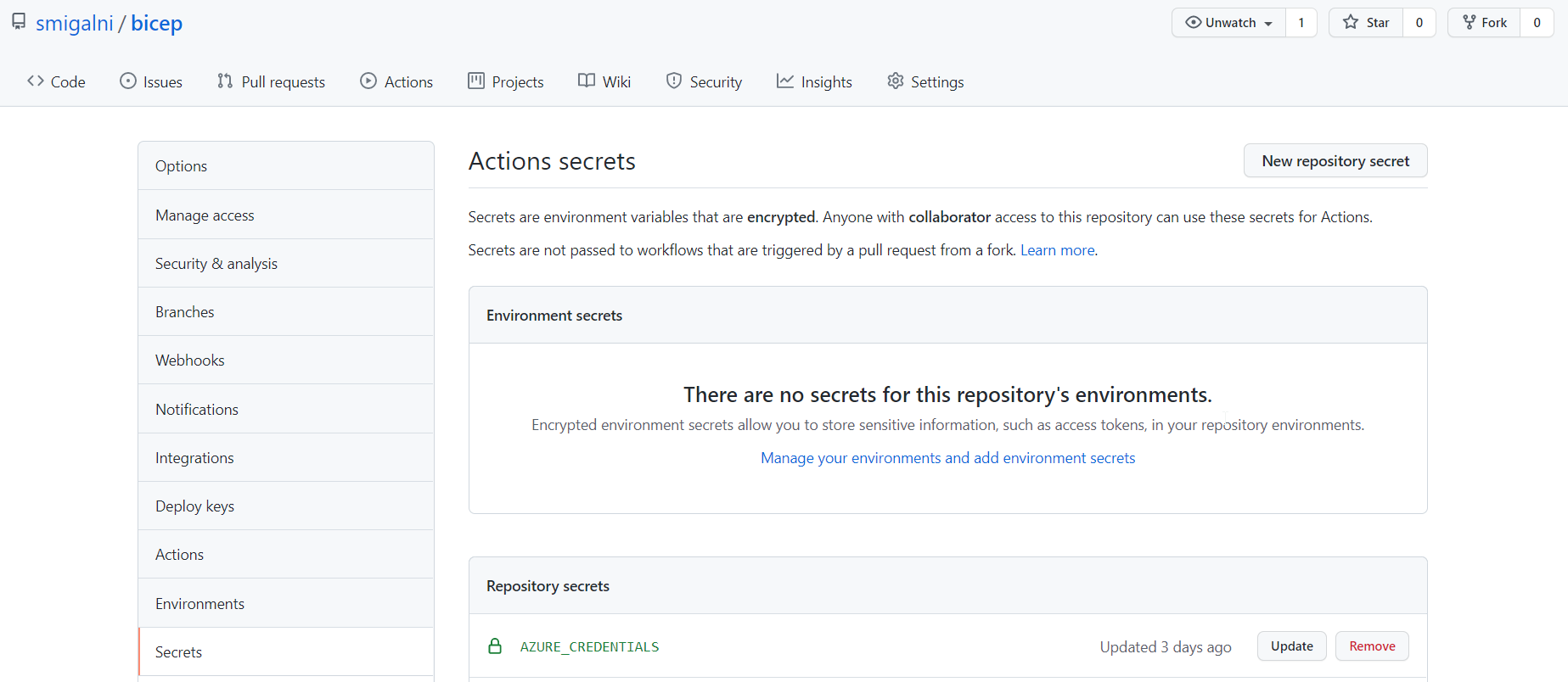 Copy the output of the last command and navigate to the Settings -> Secrets -> New repository secret