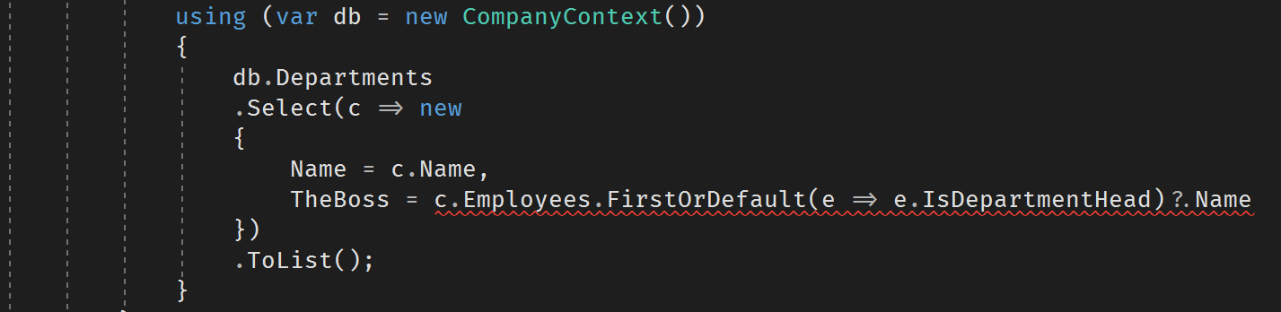 And if I remove it, will it not crash and burn if there should be a department with no department head? I mean, I am dereferencing the Name of the first employee that has the IsDepartmentHead flag set to true and there could be none.