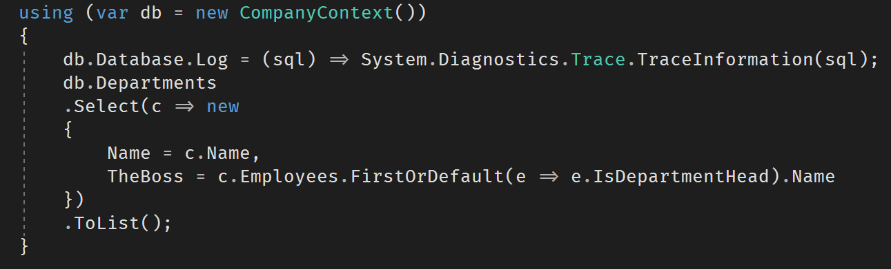 But what we have done now is querying for all departments and then turned the result into an in-memory list that we then project in code. And the nested query for the department head is done in code, not in the database.