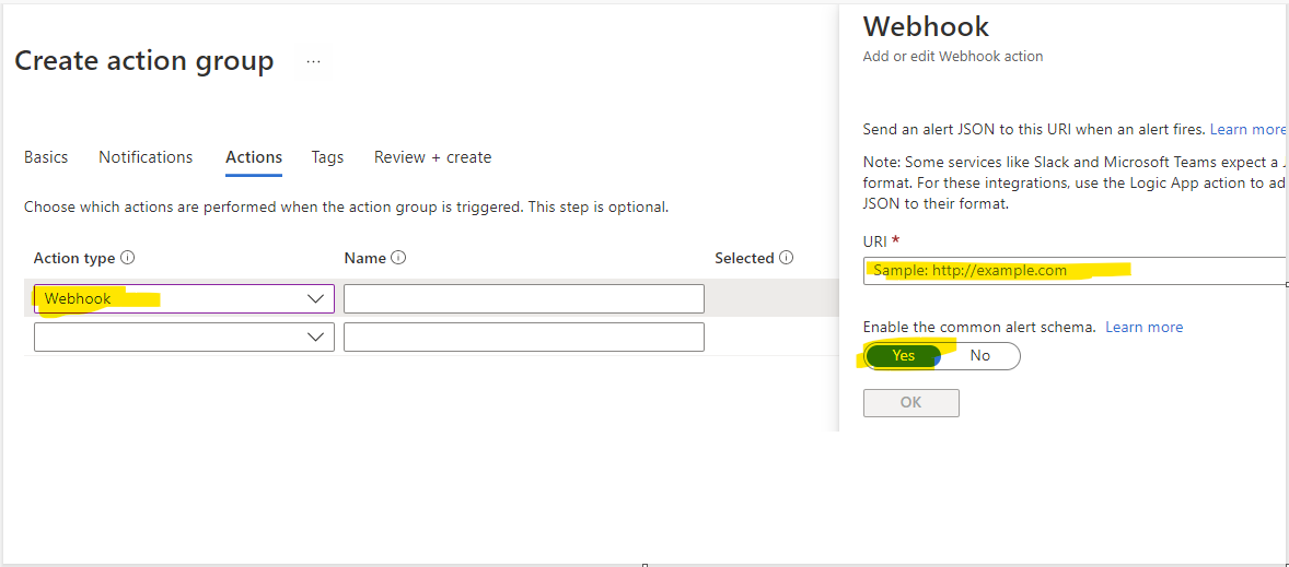This is where you specify the URL of the webhook that should be called. It cannot call the Slack webhook directly because it does not follow the contract Slack uses. Therefore we need something in the middle, that can parse the common alert schema used by Application Insights and post to the correct format to Slack.