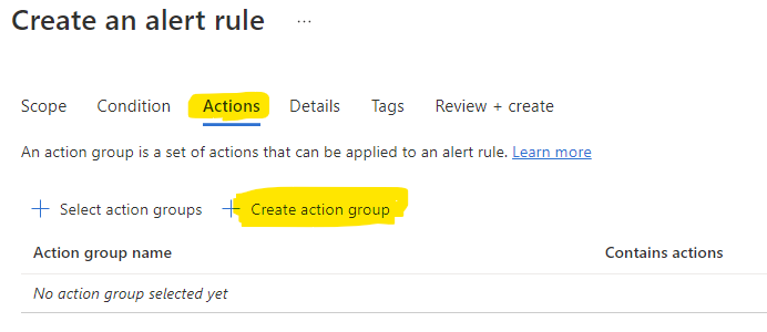 When creating the alert rule we need to assign it to an action group: