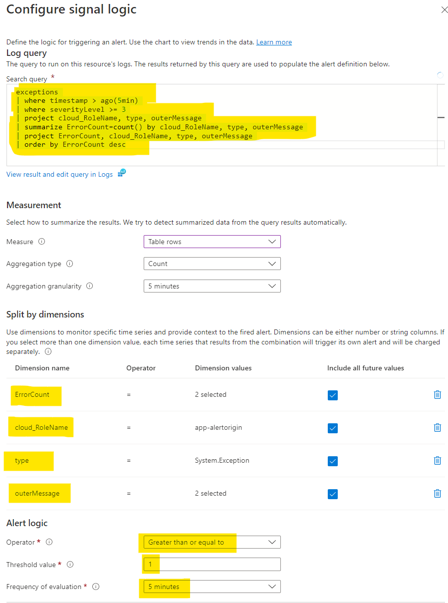 - The alert logic runs the query every fifth minute (which should include everything). If any exceptions (greater than or equal to 1) the alert should fire.