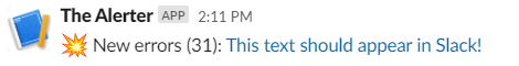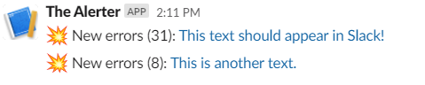 Here's an example where my app generates two unique errors multiple times (31 and 8), and the output in Slack is:
