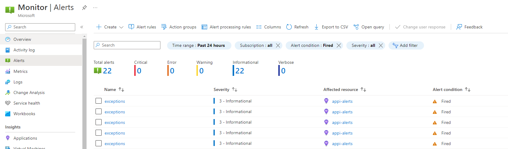 The app will produce an exception when navigating to it's root endpoint. During the next five minutes an alert should kick in, and you can find the fired alerts in the Azure portal: