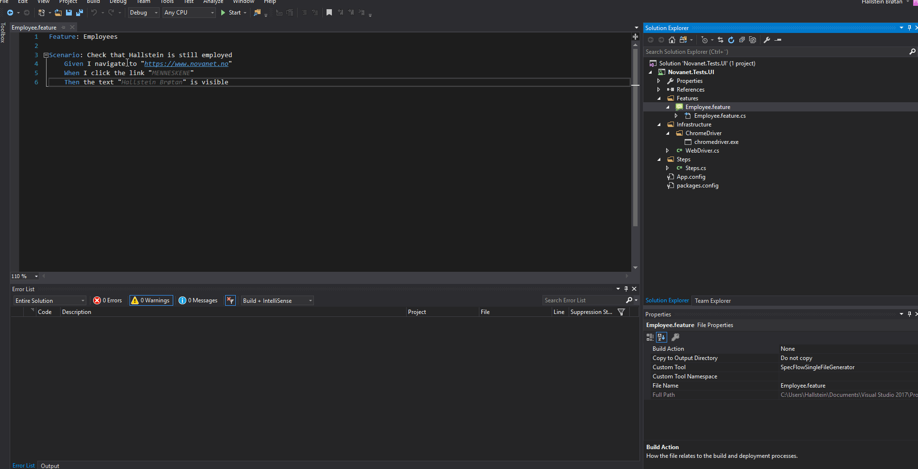 Right-click the "Employee.feature"-file in Solution Explorer and the option "Run SpecFlow Scenarios" (click image to view full screen):